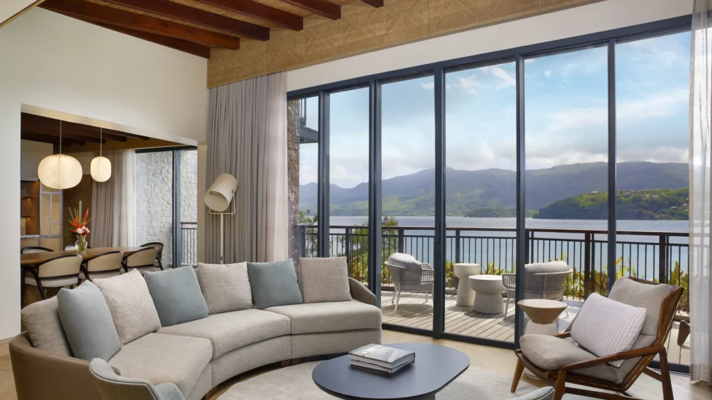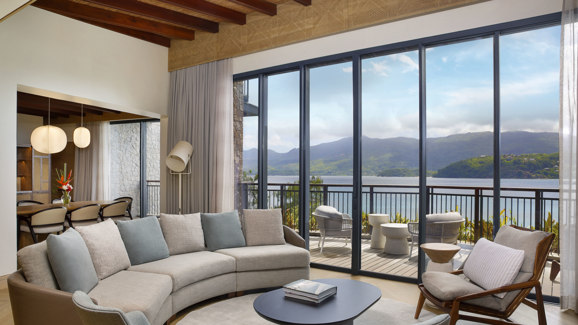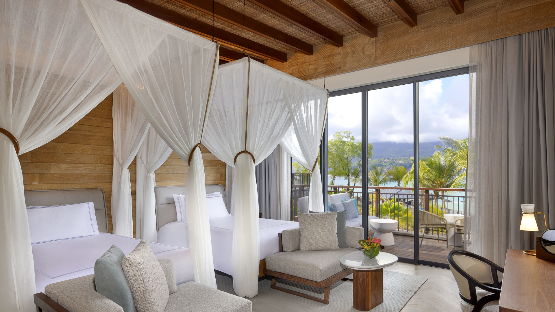 TWO BEDROOM CLIFF HOUSE PANORAMA SUITEKiemelt elhelyezkedésű lakosztály két hálószobával, kilátással az Anse La Mouche öbölre mindkét erkélyről. Külön teraszon napozóágy.