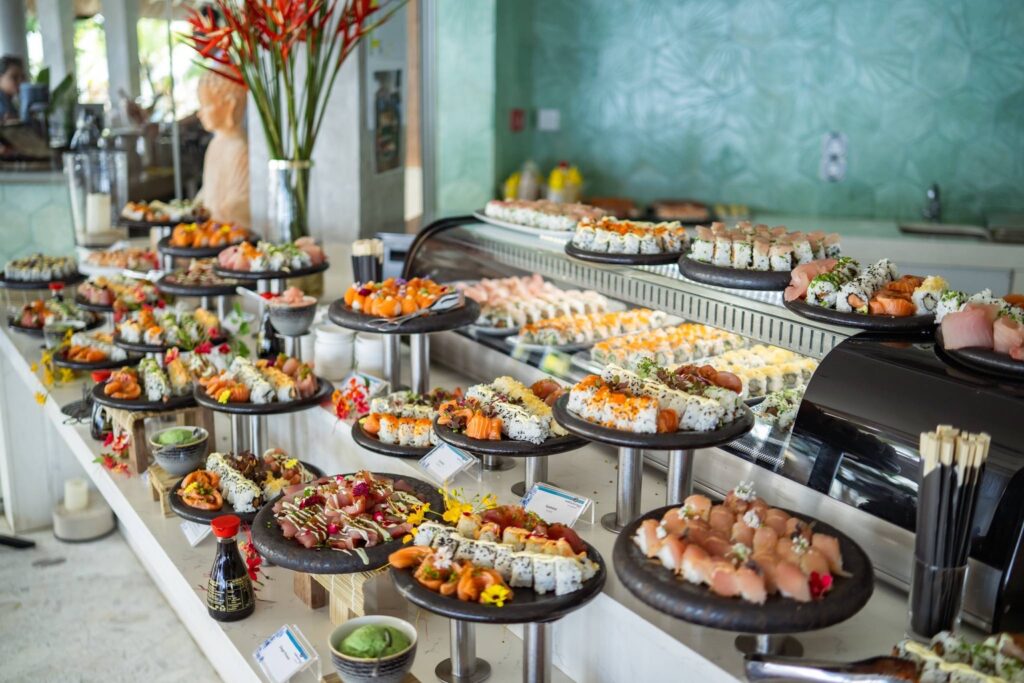 Büfé étterem, amely reggelit és vacsorát kínál, élő főzőállomásokkal.